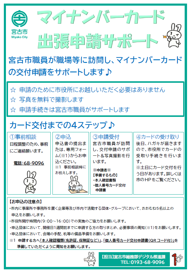 宮古市内に事業所などを置く企業、団体、グループ向けに、マイナンバーカード出張申請を行っています